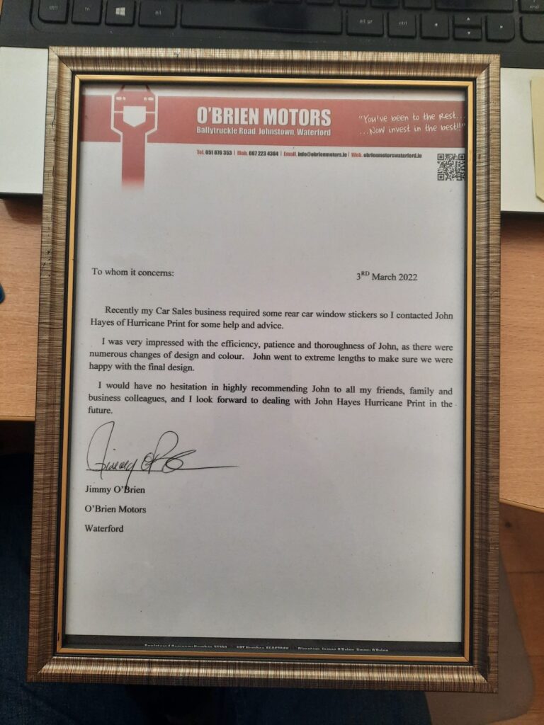 A big thanks to Jimmy O’Brien of O’Brien Motors Waterford for the fantastic framed testimonial he gave us as a result of our work on his full colour car stickers.