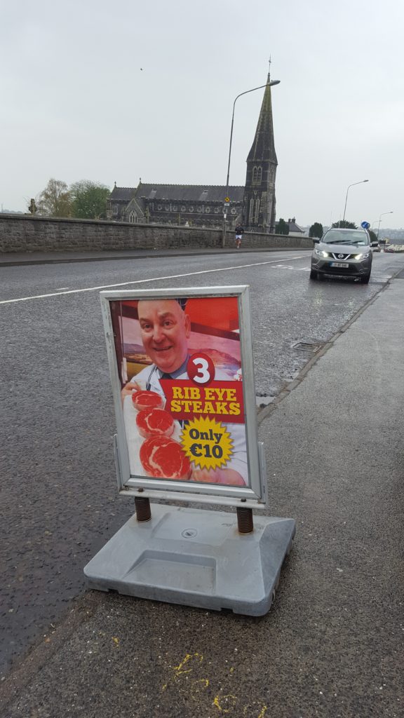 The poster is a large size and its printed on a heavy 450gsm vinyl so the material is waterproof and ideal for outdoor use. The object of the design is to capture the attention of motorists passing by their busy shop which is located beside Ferrybank Post Office.